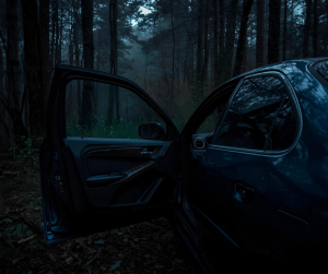 I rotated the spotlight and aimed the beam back to the vehicle until I’d zeroed in on the driver’s side. To add to the skin-crawling, heart-pounding, horror movie ambiance, the door was open. However, from my angle, I could see only the outside of the door, leaving the other side and the car’s interior a mystery.